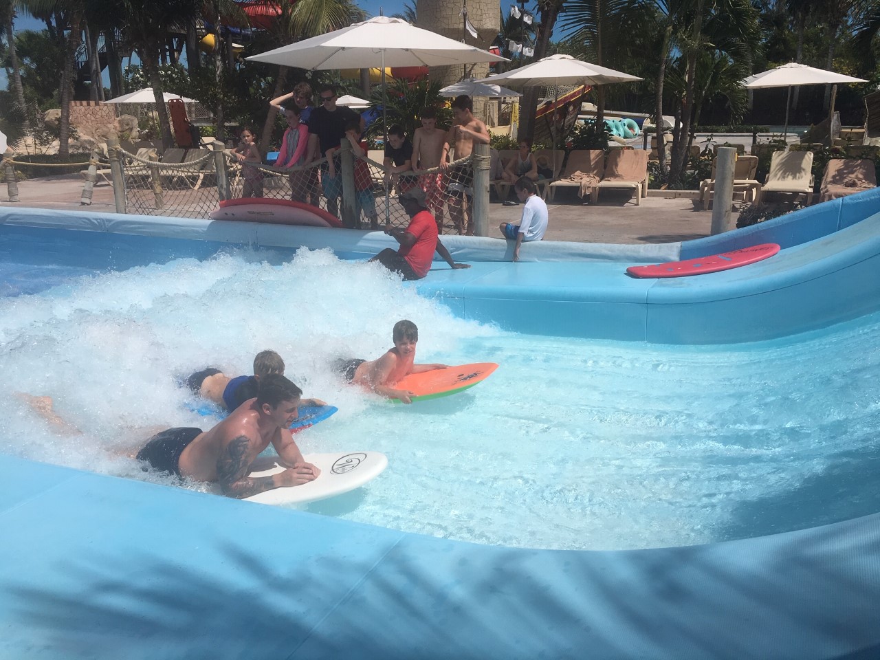 The amenities at this place are insane, and when they say “all inclusive,” they really mean it. There are 21 restaurants and bars, including the swim up bars, and there is something for everyone. We had two 8-year-old’s with us, which can sometimes spell a culinary disaster, but not here! If they didn’t like the food at a particular place, then we’d get them food from somewhere else and bring it to the place we wanted to eat. There are several pizza stands near the various pools, and on more than one occasion we grabbed them a pizza to eat while we ate at the restaurant of our choosing. However, that wasn’t necessary often because they have such great options. There are buffets at many of the restaurants, and the menu options are great for all ages. They even have a Japanese steakhouse, which was a huge hit with Sam. Aside from enjoying the food and beverages, we went sailing on a hobie cat, and we had an excursion on a glass bottom boat to see the coral reef (third largest barrier reef in the world), sea turtles, and various fish. We went snorkeling as well. We took the resort’s advice and walked about 10 minutes down the beach to a place with a large reef that was protected by a circle of buoys. There, we saw lots of coral, colorful fish, sea turtles, and a sting ray. However, since our equipment said “Beaches” on it, it was pretty obvious that we were not staying at the particular resort that was located on this portion of the beach. Julie was sitting on one of the beach chairs under one of that resort’s umbrella, and an employee kindly asked her how long she planned on staying there. We took the hint and began our journey back to Beaches.