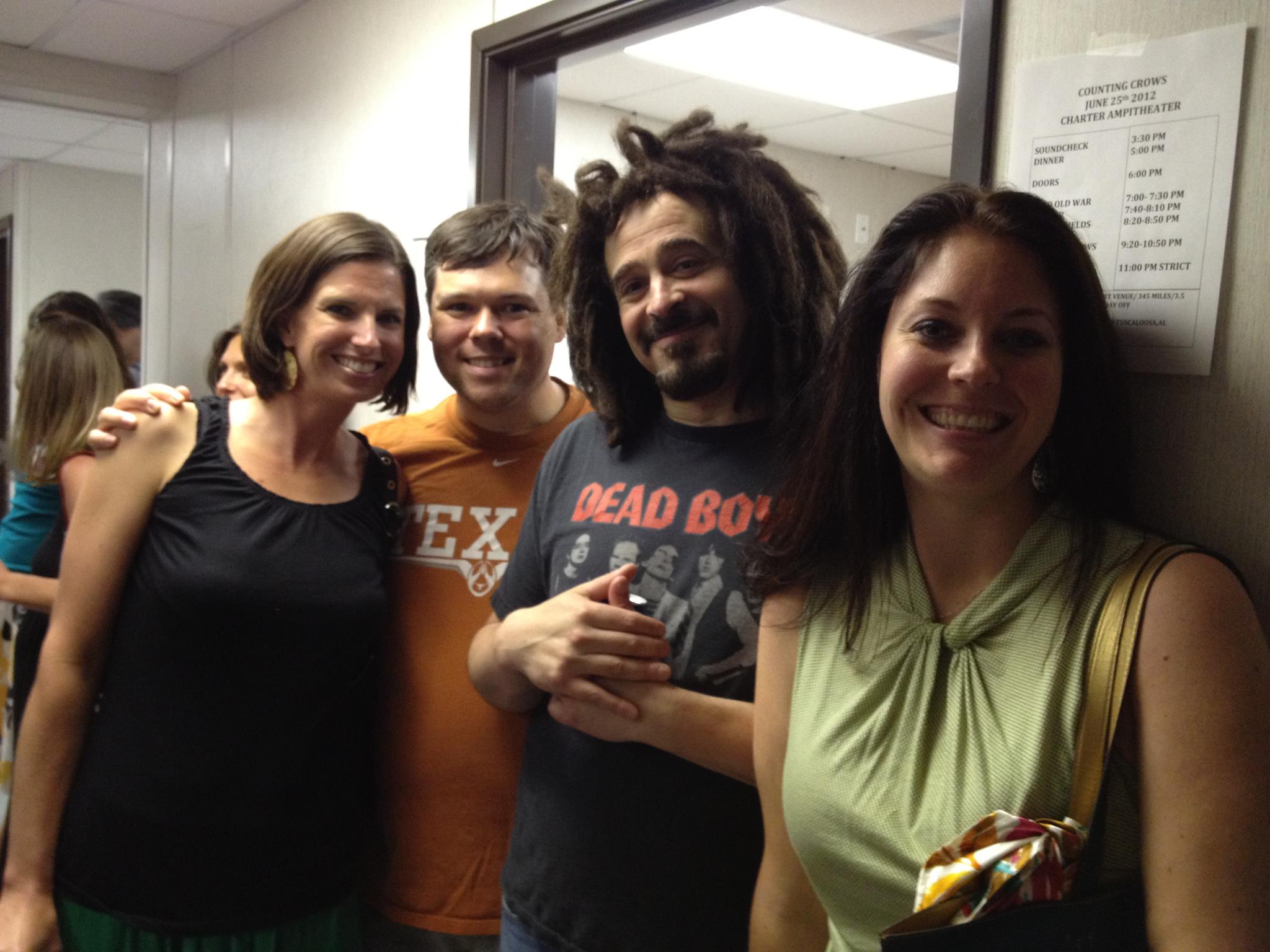 One thing you may not know about Counting Crows, unless you’ve been to a lot of their shows, is they like to highlight one or two local agencies who provide services for causes the band cares about. One such issue is domestic violence, so when they came to Greenville one year, they picked Julie’s organization to come out to the show and set up a booth. They were happy to oblige, and I got to tag along. After the show, one of the opening acts came out to thank the women (and me I guess, but probably not) for being there, and they invited all of us to come back stage with them. We happily accepted, and on our way in we saw him; Adam Duritz was chilling near the entrance chatting up some dude. As I walked past him I manged to muster, “Great show,” and stuck out my hand. He said, “thanks,” and actually shook my hand. That would have been enough for me, but we kept going inside to hang out.